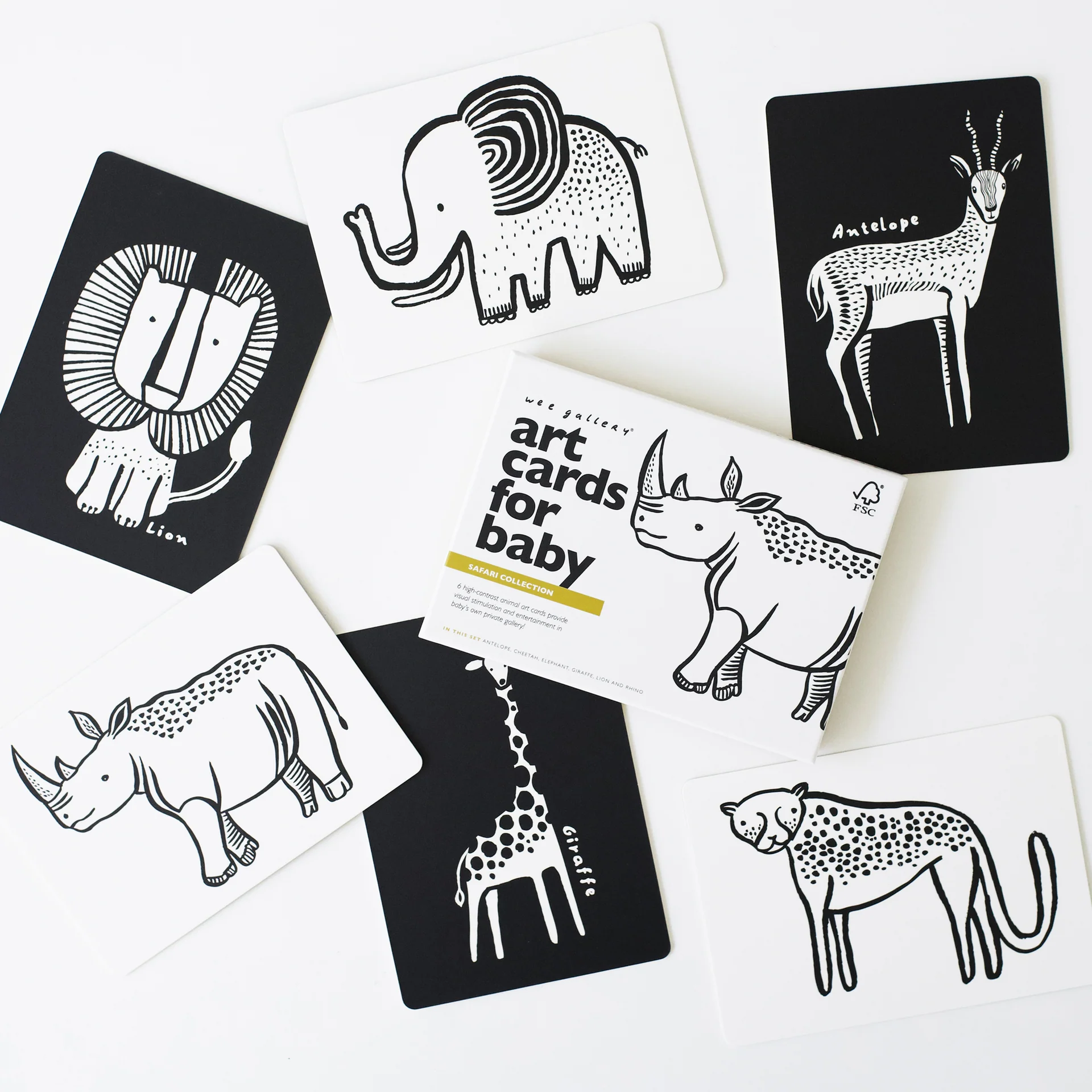 Babies are fascinated with black and white designs. Right from the start, our cards begin to aid in a baby’s cognitive and visual perception because, with developing vision, they are able to see the high contrast pictures. Babies love our Art Cards — from day one they can grab the attention of a newborn. These cards grow with your child as the shapes come together to form patterns, whole images, inspire tummy time activities, and later become flash cards of their animal pals.