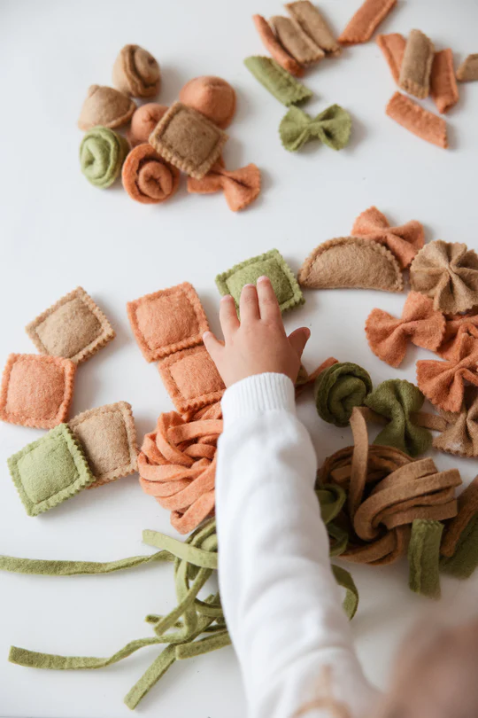 Bring a dash of culinary excitement to playtime with this handmade felt pasta set. Featuring a variety of classic shapes: ravioli, penne, farfalle, tortellini, and tagliatelle in soft, earthy tones, each piece is crafted from natural wool felt for a rich, tactile experience. Great for pretend play kitchens and sensory bins.