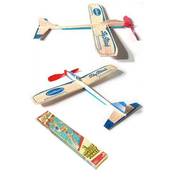 Wind up the rubber band powered engine and away she flies. This balsa wood toy is an american original plane by Guillow’s. She soars up to 50 feet with a 12 inch wing span. Our package includes 2 propellor powered flyers for racing or sharing.