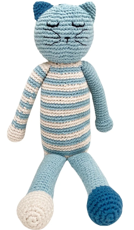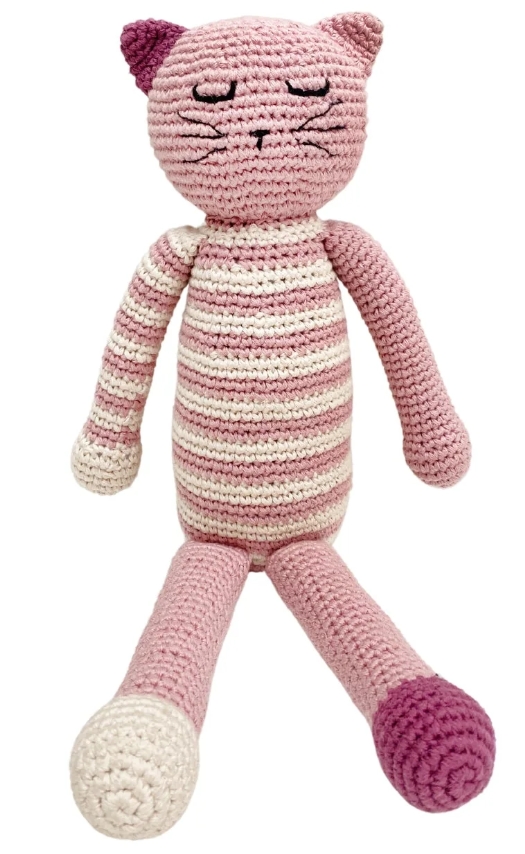 Freshen up the nursery with this whimsical sleeping kitten stuffed animal. Available in pink or blue. This heirloom toy is designed with the safety of little ones and is handmade with organic cotton yarn. The rattle inside this soft toy gives a very soft jingle when shaken. Pebble products are made entirely by hand with natural materials and as such there will be slight variations in size, colour and design in line with the unique nature of this product.
